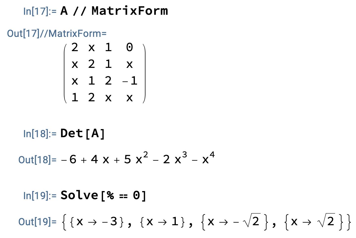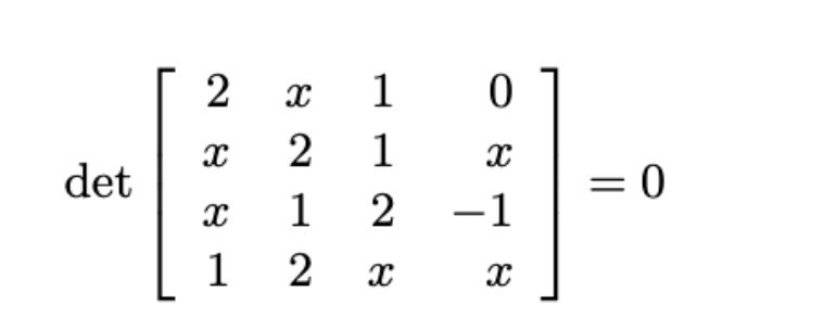 Har försökt lösa denna uppgift med vanlig determinant operation. Men då får jag -x4-2x3+5x2+4x-6=0 vilket är omöjligt.