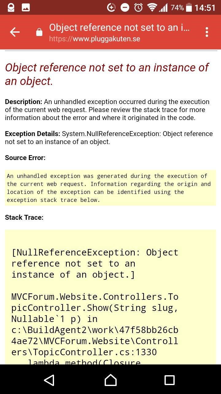 Troligast är att det är ett programmeringsfel på serversidan. Du kan prova att återställa webbläsaren och ta upp pluggakuten.se på nytt.