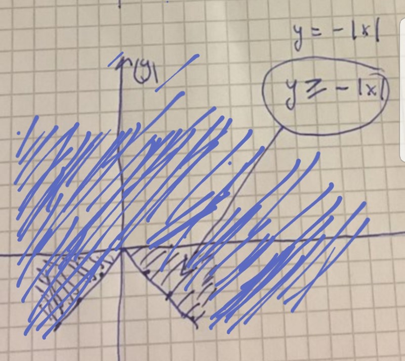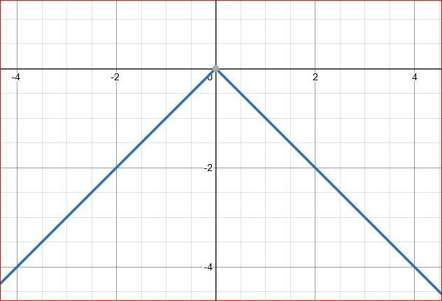 Ja jag har läst ditt tidigare inlägg, och nej förstår fortfarande inte hur graferna hänger ihop, y = -|x| , hur kan x anta positiva värden i den på x axeln. Eftersom |x|, om x=-1 |x|= 1, viket leder till -|x| = -1, dvs du kan ju aldrig få ett positivt värde.