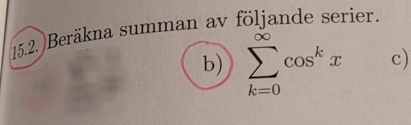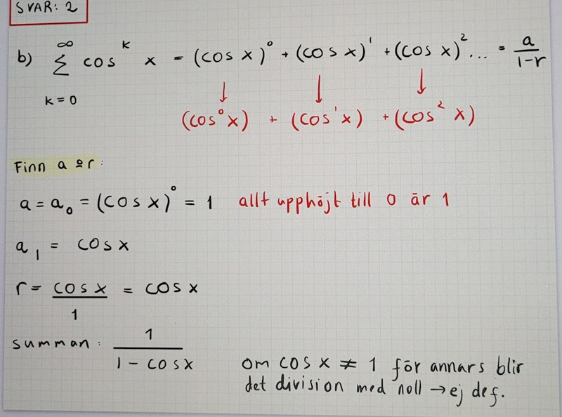 Micimacko skrev:Omskrivningen är nog inget fel på, men formeln du använder gäller bara för kvoter som är -1<r<1, så bådenär cos x är 1 och -1 måste lösas med annan metod.