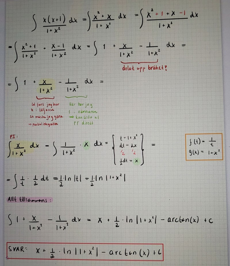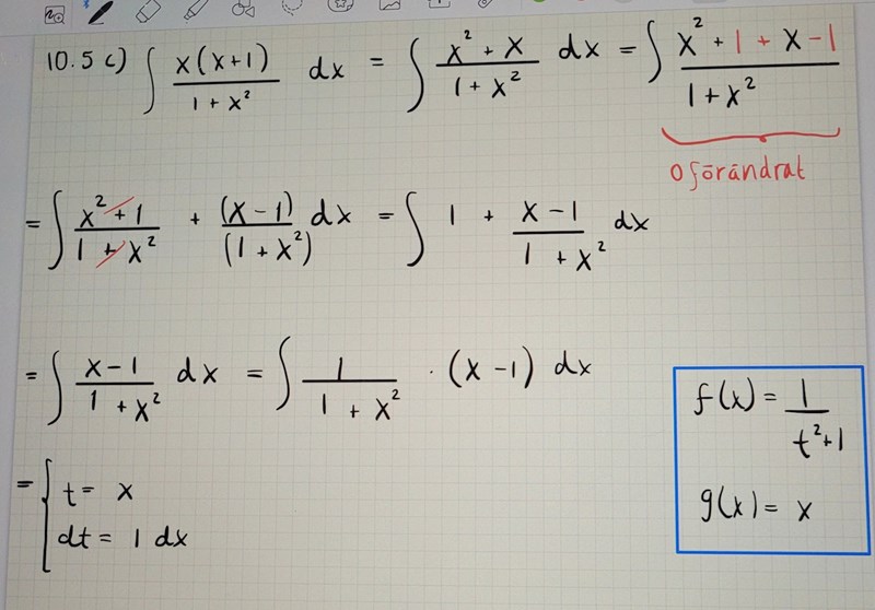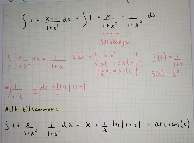 Här ska jag ta fram den primitiva funktionen och jag valde att skriva om kvoten så jag kunde få 1 + (x-1)/(1+x^2), men sen så ville jag göra ett variabelbyte men det blir inte riktigt rätt. Vad bör jag göra istället?