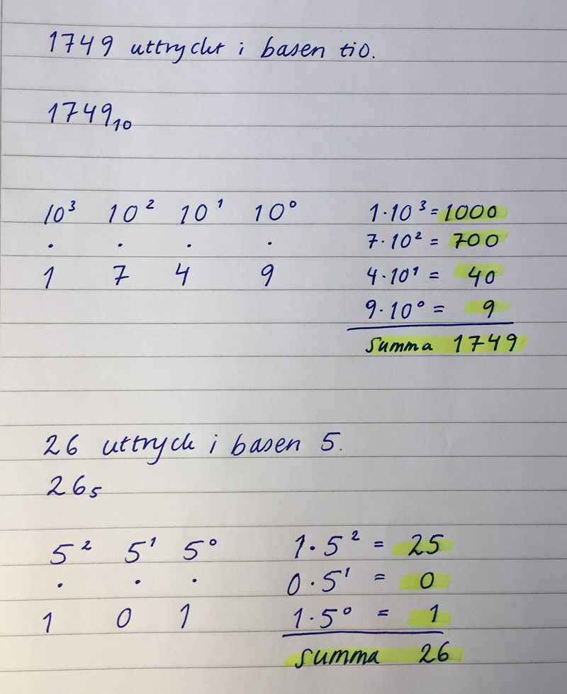 26 i bas 10 är då samma sak som 101 i bas 5.