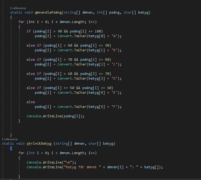 skrivUtBetyg()behöver du indexerabetyg[]medbetyg[i]. Annars går koden inte igenom kompilering.using System; namespace Betyg { class Program { static void Main(string[] args) { string[] ämnen = { "Matematik", "Svenska", "Engelska", "Historia", "Fysik" }; int[] poäng = new int[5]; char[] betyg = { '-', '-', '-', '-', '-' }; läsPoäng(ämnen, poäng); omvandlaPoäng(ämnen, poäng, betyg); skrivUtBetyg(ämnen, betyg); Console.ReadLine(); } static void läsPoäng(string[] ämnen, int[] poäng) { bool rättSumma = true; int poangen; do { for (int i = 0; i < ämnen.Length; i++) { Console.Write("Mata in poängen mellan 0-100 för " + ämnen[i] + ": "); poangen = Convert.ToInt32(Console.ReadLine()); poäng[i] = poangen; if (poäng[i] > 100 || poäng[i] < 0) { rättSumma = false; Console.WriteLine("Ogiltig poängsumma. Poängen ska vara mellan 0-100."); break; } else { rättSumma = true; } } } while (!rättSumma); } static void omvandlaPoäng(string[] ämnen, int[] poäng, char[] betyg) { for (int i = 0; i < ämnen.Length; i++) { if (poäng[i] > 90 && poäng[i] <= 100) betyg[i] = 'A'; else if (poäng[i] > 80) betyg[i] = 'B'; else if (poäng[i] > 70) betyg[i] = 'C'; else if (poäng[i] > 60) betyg[i] = 'D'; else if (poäng[i] >= 50) betyg[i] = 'E'; else if (poäng[i] >= 0) betyg[i] = 'F'; else betyg[i] = '!'; } } static void skrivUtBetyg (string[] ämnen, char[] betyg) { Console.WriteLine("\n"); for (int i = 0; i < ämnen.Length; i++) Console.WriteLine("Betyg för ämnet " + ämnen[i] + " : " + betyg[i]); } } }