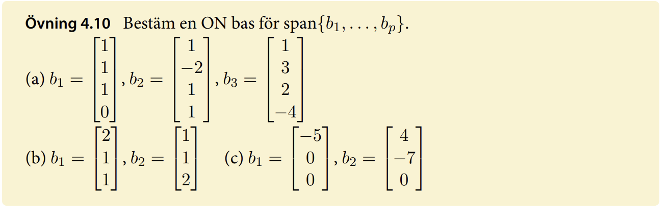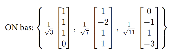 Jag har gjort a), men det verkar som jag har förstått denna fråga fel. För jag förstod det som att jag skulle hitta en orthonormal basvektor som var orthogonal till de andra vektorerna och samtidigt ha längden 1 och kom fram till en vektor = [-11,1,10,3]*sqrt(231) och tänkte att jag var klar där man facit hade istället flera vektorer och jag förstår inte varför.