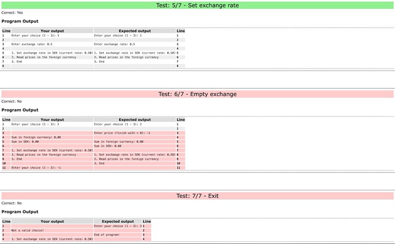 Med test case 7, din kod skriver inte ut Not a valid choice! under några omständigheter. Har du visat samma kod som du testar?