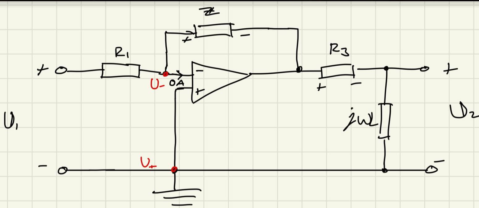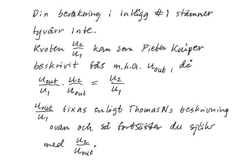 Med samma spänning vid plus och minusingången och med spänningdelningslagen för jag: (är osäker på om det stämmer). Men u+ är ju jordad, så den är väll noll och då blir u- också noll. Förstärkningen blir sen , med . När jag sätter in det får jag som jag inte vet hur jag ska förenkla så jag undrar om jag har gjort rätt.