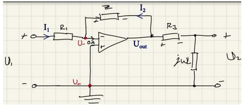 Jag skulle nog börja här med att introducera en variable Uout (utgångsspänning av OP:n) och spänningsdelning av den. Kanske att det blir samma (men ett minustecken bör nog finnas i uttrycket).