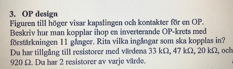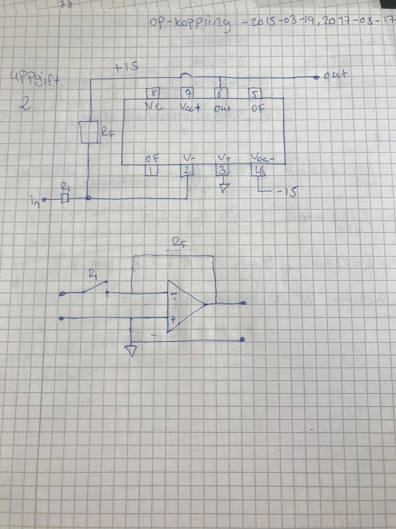 I första uppgiften ska du använda op-ampen som en inverterande förstärkare. Den har du ritat riktigt. Men du måste bestämma värdena på Ri och Rf också.