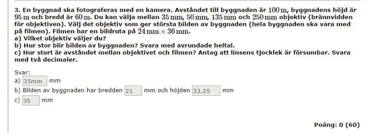 En byggnad ska fotograferas med en kamera. Avståndet till byggnaden är 100m, byggnadens höjd är 95m och bredd är 60m. Du kan välja mellan 35mm, 50mm, 135mm och 250mm objektiv (brännvidden för objektiven). Välj det objektiv som ger största bilden av byggnaden (hela byggnaden ska vara med på filmen). Filmen har en bildruta på 24mm×36mm.