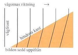 Observera i figuren att när vågfronten bromsas (hastigheten minskar), så blir avståndet mellan vågfronterna kortare