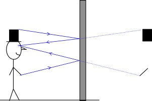 Ljuset från handen strålar ut i alla riktningar men den strålen som går som det blå strecket i bilden är den du ser. Den kommer då att se ut som den kommer från en punkt bakom spegeln som strålar enligt den streckade linjen. Samma sak med toppen på hatten.