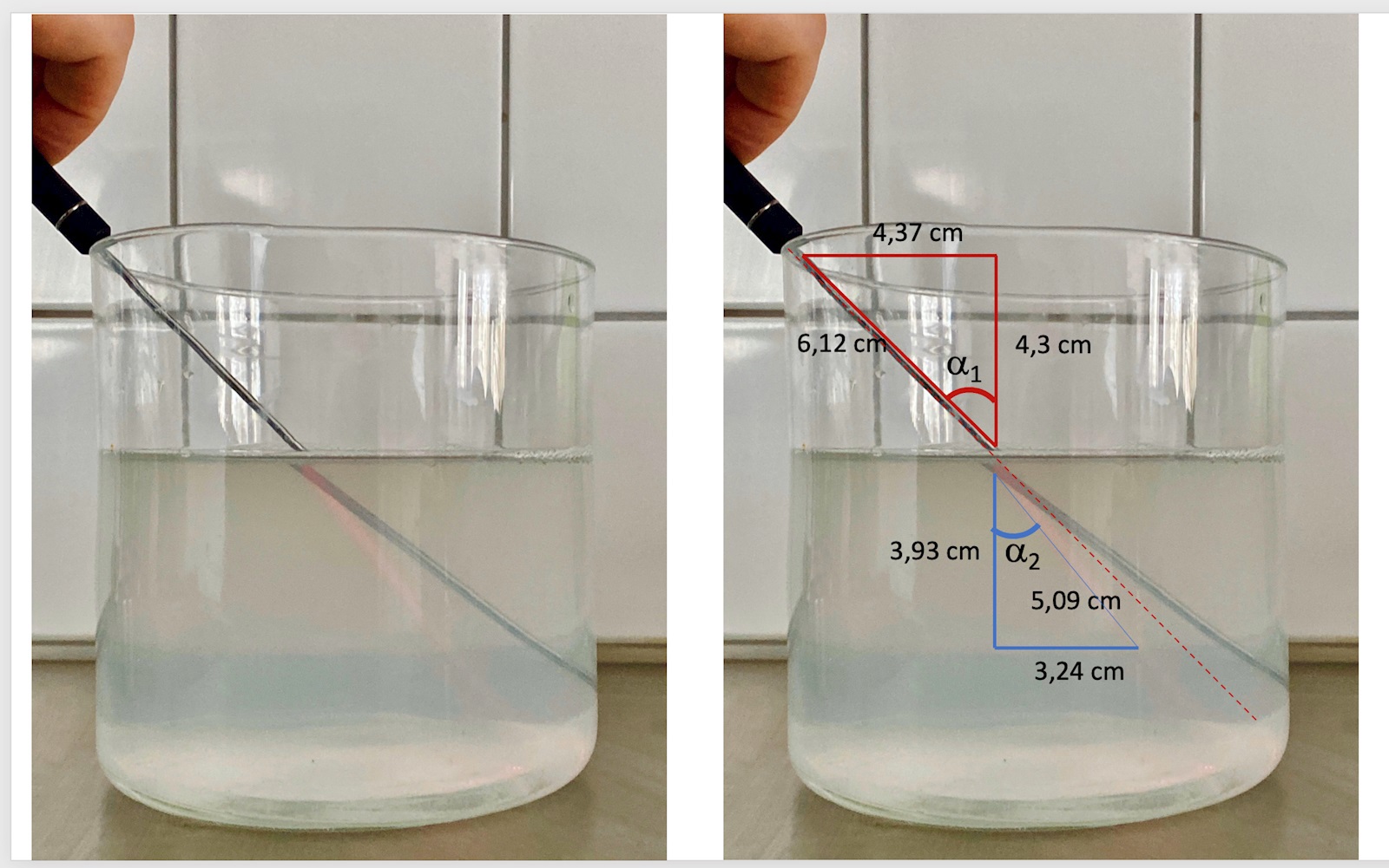 Min hypotes är att "brytningen" av pinnan är korrelerad till brytningsindex av vatten. Den verkar även för många olika glasformer och kvalitén kommer till ett värde av 1,17 som är hälften av 1,33 och åt fel håll. Om man förstår vad ligger bakom och hur sambandet med brytningsindexen är, så kan man använda det för att bestämma brytningsindexen på ett mycket enkelt och överraskande noggrann sätt. Bara vad är optiska teorin bakom?