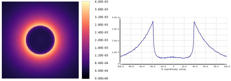 Belysningen på botten blir som nedan. (Den absoluta skalan är inte relevant.).Detektorns storlek är här 200 mm x 200 mm. Det blir ett mörkt område med radie c:a 77 mm mellan de ljusaste punkterna, så rätt nära de 76 mm som man får om man räknar med gränsen som ges av totalreflexion. Det blir so tidigare sagt inte helt mörkt i mitten.