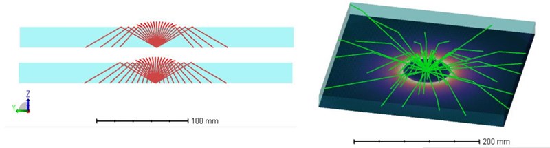 Här är en simulering. Glasbiten är 22.5 mm tjock och har här en kvadratisk basyta med sida 300 mm (inte relevant). Jag tog brytningsindex n = 1.55. En punktkälla ligger på botten där jag även har lagt en detektor som detekterar reflekterade strålar. De röda strålarna visar några strålar från punktkällan. Man kan se att för stora vinklar så kan inte ljuset smita ut. I den undre röda bilden har jag även med att det blir en reflex för små infallsvinklar, men energin för dessa blir relativt låg (vilket syns på detektorbilden i nästa figur). Bilden med gröna strålar visar hur några slumpmässigt riktade strålar studsar i glasbiten.
