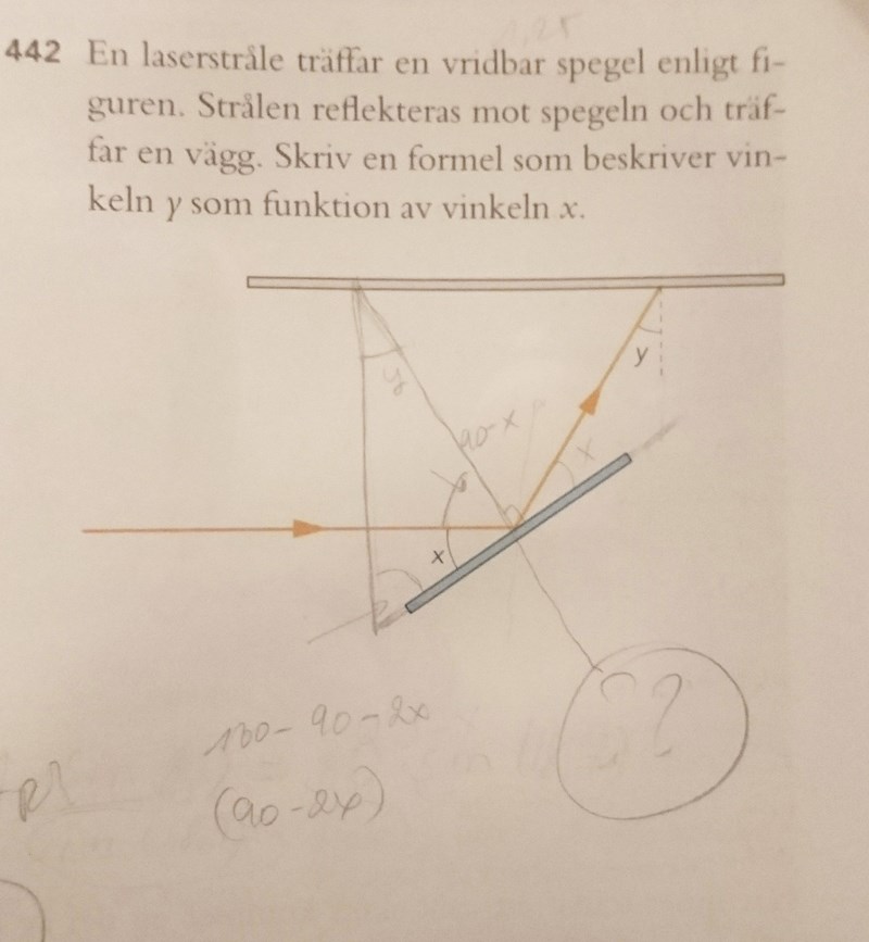 Jag kommer fram till y=90°-2x, men det verkar finnas en ytterligare formeln för när x är större än 45°. Jag förstår inte vad är det som pågår där!