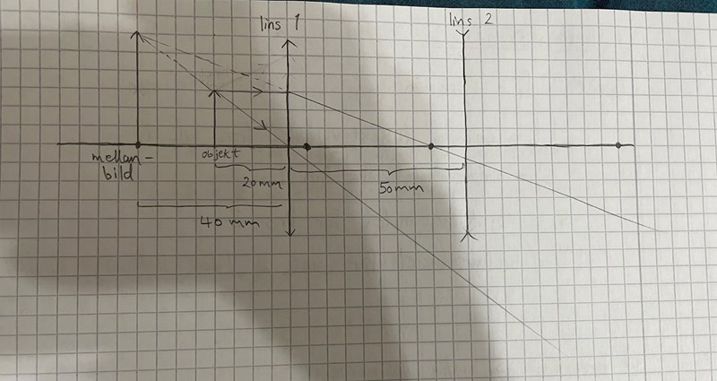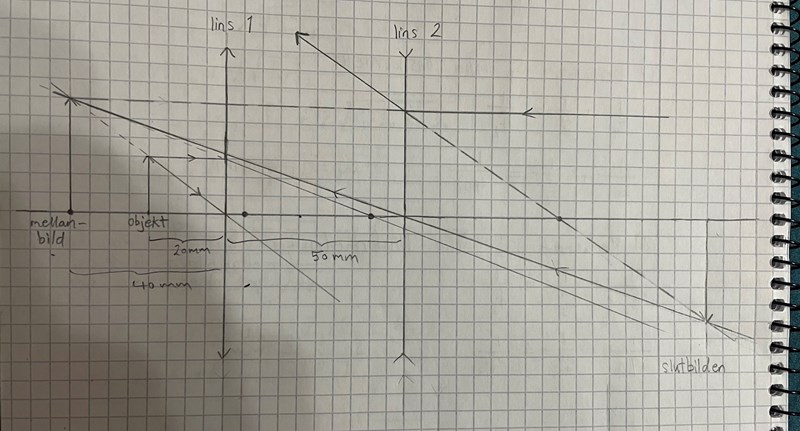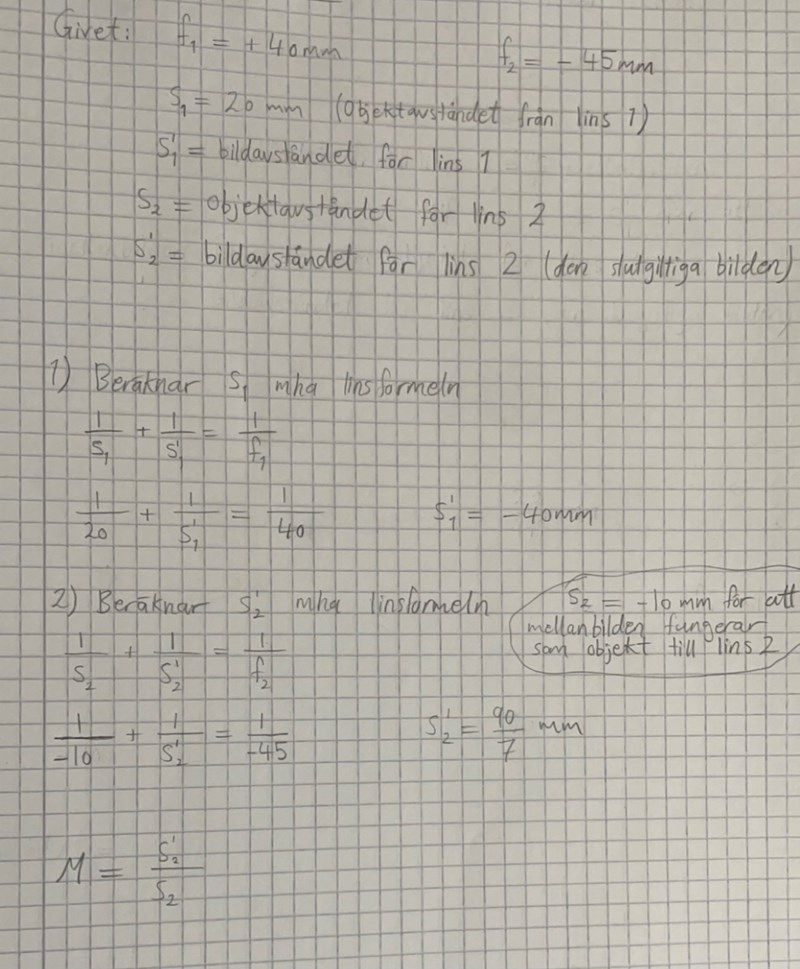 Två tunna linser med fokallängderna +40 mm (lins 1) respektive -45 mm (lins 2), sitter 50 mm från varandra. Ett 15 mm stort, reellt objekt på avståndet 20 mm framför lins 1 avbildas genom båda linserna. Använd beräkningar med mellanbild för att ta fram var mellanbilden och den slutliga bilden hamnar och hur stora de blir.