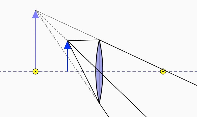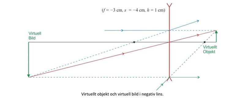 Du har strålar som kommer från en källa. De blir mindre divergerande efter den positiva linsen men de verkar fortfarande komma från en punkt till vänster om den negativa linsen.