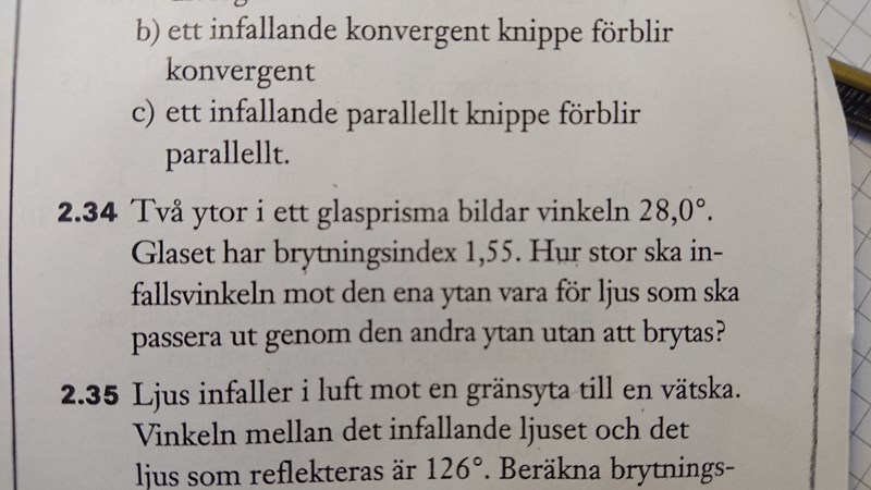 Har du försökt rita? Vilken skall vinkeln mot prismats andra sida vara för att ljusstrålen inte skall brytas?