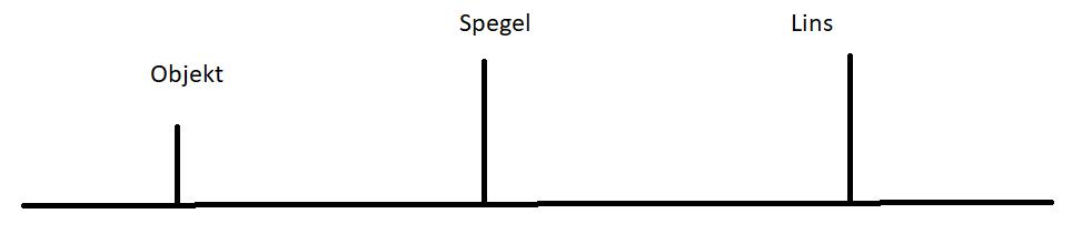 För tydlighetens skull har jag ritat upp scenariot här. När jag läser texten tolkar jag det som att ordningen är såhär, men borde inte ljuset då bara gå från objekt till spegel och tillbaka? Jag visualiserar det som att jag själv är objektet och tittar in i en spegel. Om där då är en lins bakom spegeln så påverkar den ju inte vad jag ser. Jag ser ju inte ens linsen.