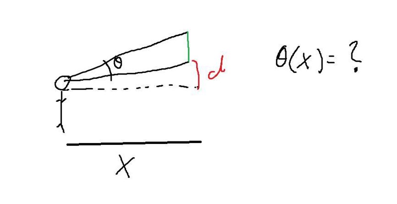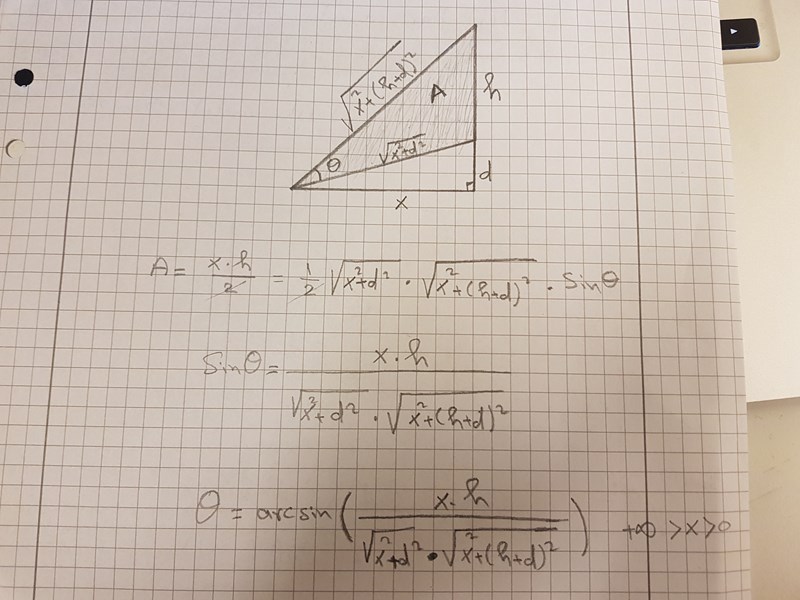 Jag hade provat trigonometri - ser inte vad som är likformigt här. Du har två rätvinkliga trianglar med basen x, en har höjd d och en har höjd d+h. θθ kan beskrivas som skillnaden mellan vinklarna i de trianglarna.