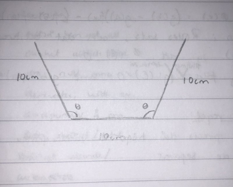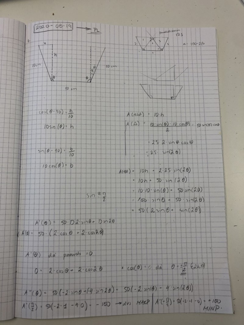 jag försökte lösa detta problem: "Ossian vill bygga en ny hängränna från en 30 cm bred plåt. Han böjer plåten till en ränna med ett tvärsnitt som ser ut som figuren till höger. Hur ska Ossian välja vinkeln θ så att tvärsnittsarean blir så stor som möjligt?" Bilden som gavs:
