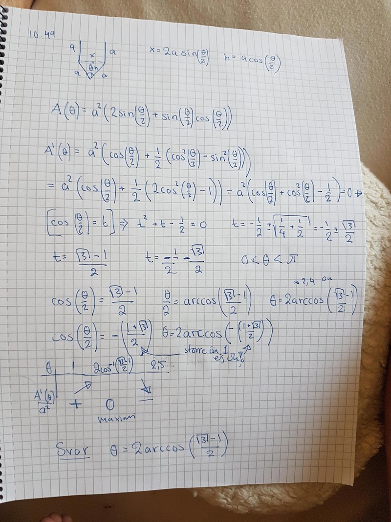 Yngve skrev:Louiger skrev:Ja i början vilket jag korrigerade och ersatte x med 2asin(alfa/2) och a=1 då det i detta fall inte spelar någon roll vilken längdenhet a har då de alla är av samma längdvilket gör att den enda variabeln är alfa! Jag fattar verkligen inte vad du menar bortsett från att jag tror att du inte kollat på fortsättningen av det jag skrivit. Mvh LouiseJag ska försöka förklara vad som är fel med A(x) och A'(x).