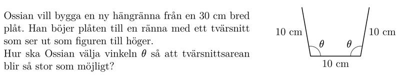 Försökte derivera och hitta extrempunkt men fick bara derivatan till 0 när vinkeln var 0. Hur gör jag annars?
