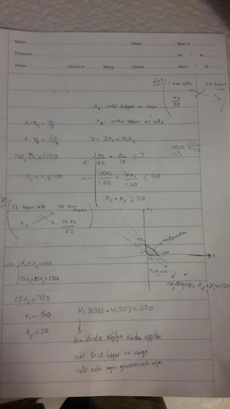 Dina villkor ser bra ut, men det du har skrivit att svaret ska vara är egentligen målfunktionen vars värde ska maximeras, dvs inkomsten uttryckt med hjälp av och .