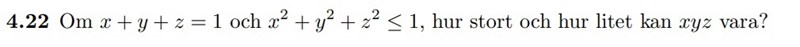 Jag har suttit: f = xyz, g = x + y + z = 1 och h = x^2 + y^2 +z^2 <= 1