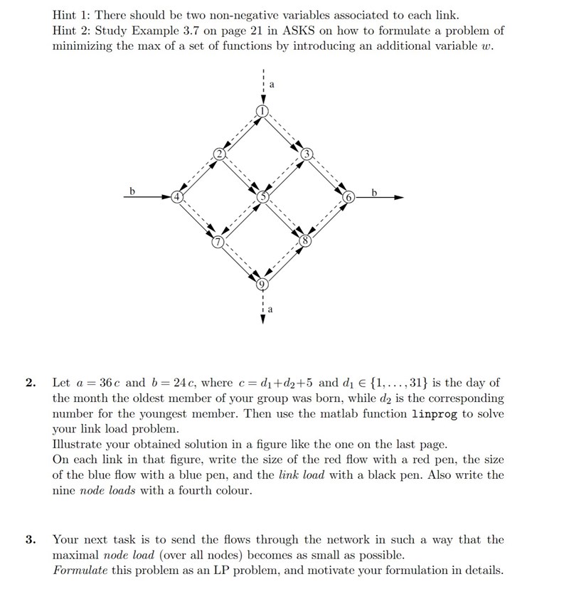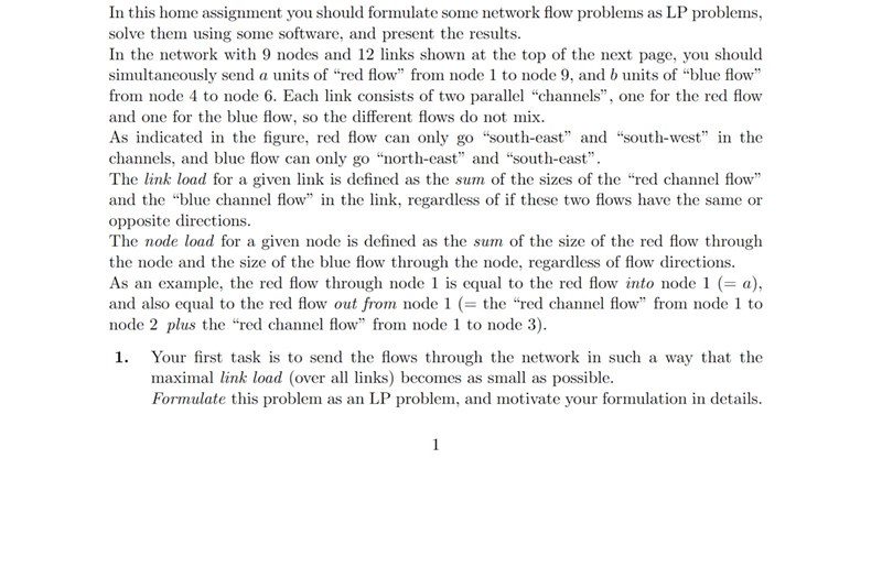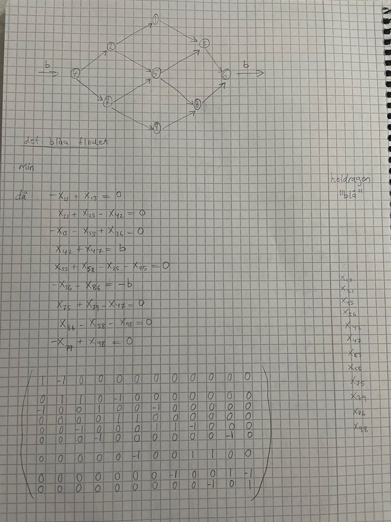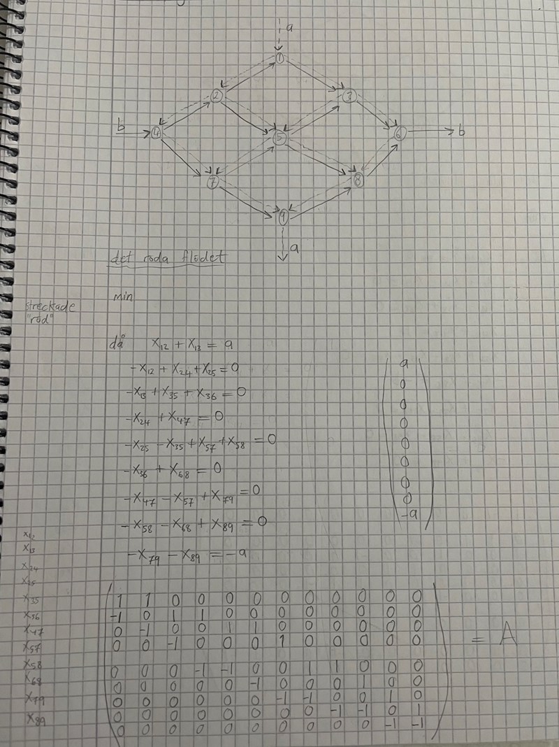 På uppgift 1 så förstår jag inte hur jag ska formulera problemet som ett LP problem när "kostnaden" för pilarna inte finns angivna. Alltså hur ska målfunktionen se ut. Villkoren har jag försökt att ställa upp och fått följande för det röda respektive det blåa flödet, men är osäker på om det är rätt. Jag kan ha misstolkat uppgiften helt.