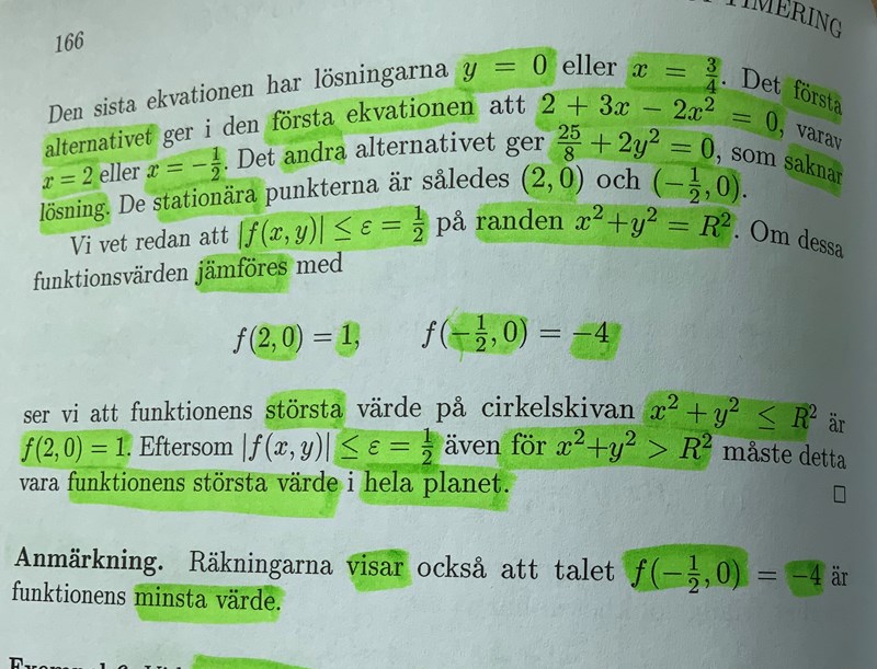 Fast på en variabel behöver vi väl inte checka +- oändligheten (bara här i flervarre) (förutom randpunkterna då)? Så i boken hittar man f(2,0) = 1 och f(-1/2,0)=-4 och så säger man att utanför en kompakt är abs(f(x,y)) <= dvs. mindre än maxvärdet 1 och större än minvärdet -4? Hur vet vi att abs(f) är mindre än epsilon, kan det inte finnas större abs(f)? Det gäller väl bara om r —> oo? (kompakten blir väl större desto mindre epsilon blir)