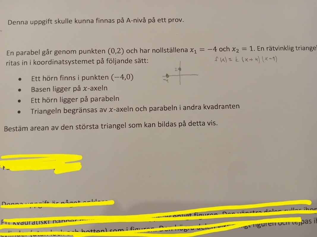 Okej tack. Skulle man kunna ha basen på triangeln som x och höjden f(x-4), alltså i A(x)?