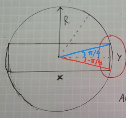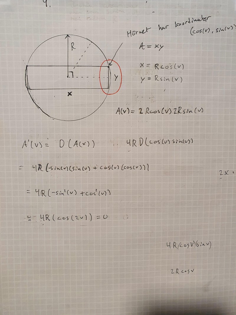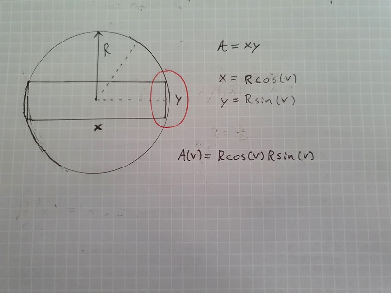 Smaragdalena menade att cirkeln är centrerad kring origo. Då blir koordinaterna (x,y) för rektangelns övre högra hörn (rcos(v), rsin(v)).