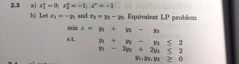 I uppgift 2.3 deluppgift b), se bilden nedan, så står det att jag ska substituera variablerna så att det inte finns några negativa restriktioner. I facit (se bifogad bild) står det att man kan sätta x_1 = -y_1 och x_2 = y_2 - y_3. Att x_1 kan skrivas om till x_1 = -y_1 kan jag förstå för då ändras olikheten i restriktionen men hur kommer man på att x_2 kan omskrivas till x_2 = y_2 - y_3?
