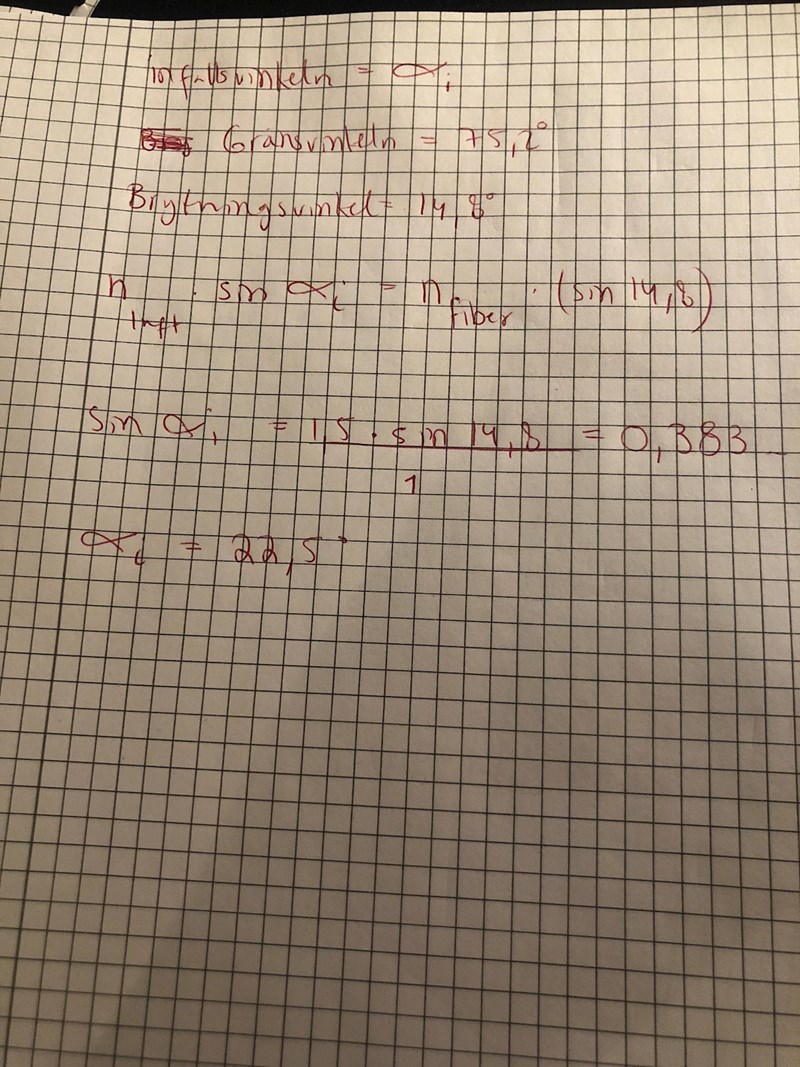 Om gränsvinkeln är 72,5 är ju 3:e vinkeln i den rätvinkliga triangeln 90-75,2=14,8. Det är vad en stråle som har infallsvinkeln=gränsvinkeln i punkten B får för vinkel mot normalen till änden av fibern, dvs utfallsvinkeln i övergången från luft till fiber.