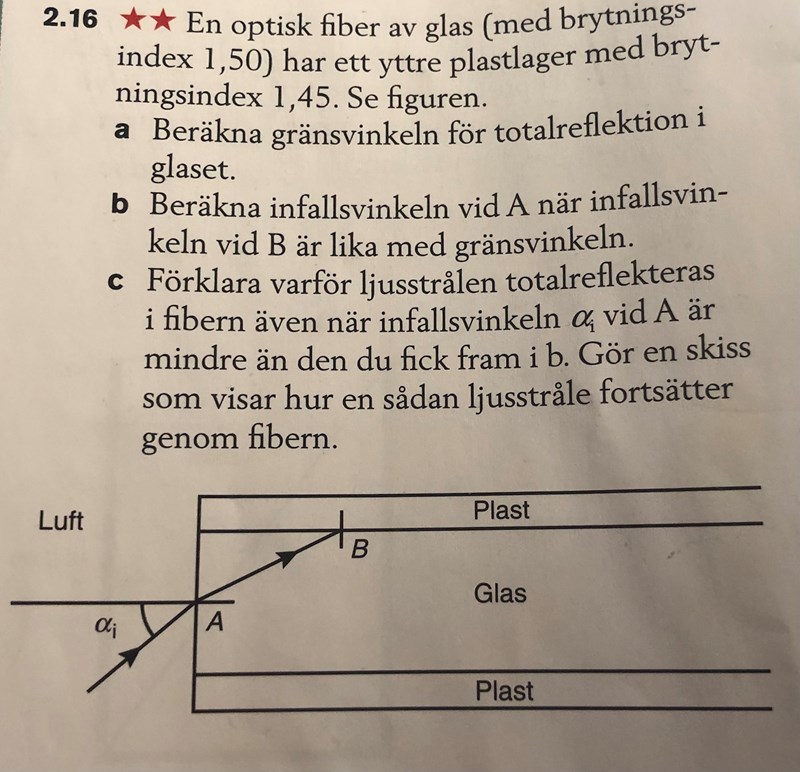 b) Hur kan man börja med uppgiften? Vart på bilden är gränsvinkeln (fick ut gränsvinkeln från a) dvs 75.2 grader)?