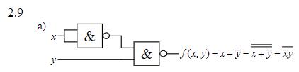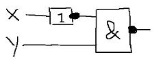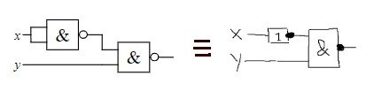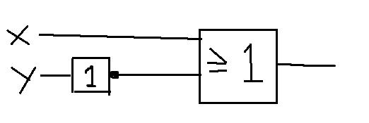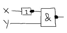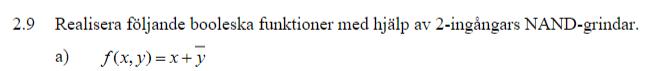 Förlåt jag hänger inte med. Jag försökte lösa uppgiften efter Macilacis kommentar (#2), dvs att först få ett uttryck som en produkt med de två faktorerna x och y, för att sedan kunna rita ett nät med en NAND-grind. Uttrycket fick jag som . Nätet till motsvarande funktion blev