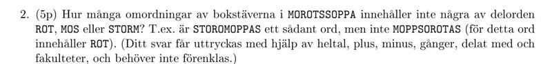 |FROT| består av alla varianter som är uppbyggda av delarna ROT, O, O, P, P, S, S, A och M. Det är 7 olika delar, och det finns 2 stycken av O, P och S och en vardera av ROT, A och M. Därför blir täljaren 7! och nämnaren 2!2!2!1!1!1!.
