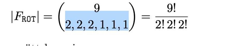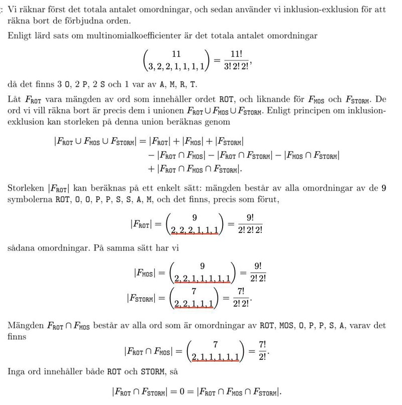 Smaragdalena skrev:|FROT| består av alla varianter som är uppbyggda av delarna ROT, O, O, P, P, S, S, A och M. Det är 7 olika delar, och det finns 2 stycken av O, P och S och en vardera av ROT, A och M. Därför blir täljaren 7! och nämnaren 2!2!2!1!1!1!.