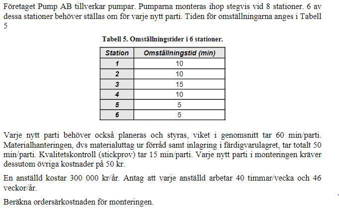 Det jag mer ville ha svar på vad en ordersärkostnad är. Jag tyckte att jag var ganska säker på det tills jag läste denna uppgift då jag inte förstår vad uppgiften har att göra med ordersärkostnad. Uppgiften har med produktion att göra och det känns mer som att jag beräknar ett kostnadspåslag på en produkt än ordersärkostnad.