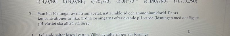 Fråga 2, förstår inte riktigt hur jag kan få fram rangordningen i PH värde. Natriumacetat kunde jag få fram ka i tabellen och räkna Ph efter det. Natriumklorid kommer att bilda Hcl + NaOH och amoniumklorid kommer att bilda Hcl + NH4OH.