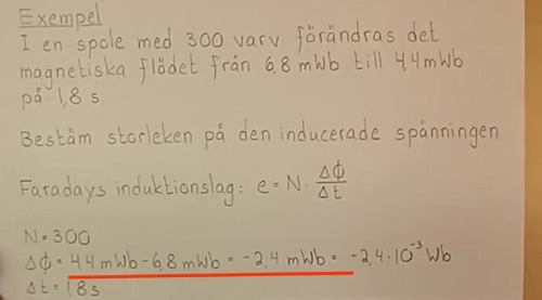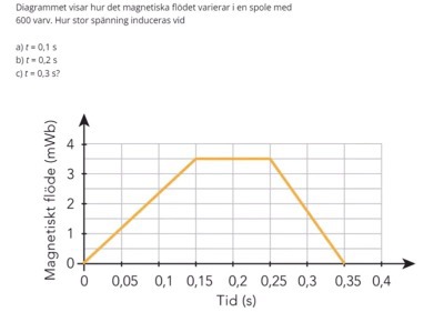 En spole har 300 varv och det magnetiska flödet förändras från 12 mWb till 45 mWb under 1,7s. Hur stor spänning induceras över spolen?