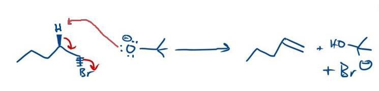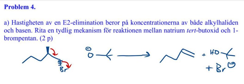 Notera att läraren har ansträngt sig extra för att med hjälp av 3D-bindningar att visa att vätet som basen tar och den lämnande gruppen måste vara anti i förhållande till varandra för att en E2-reaktion ska kunna ske effektivt.