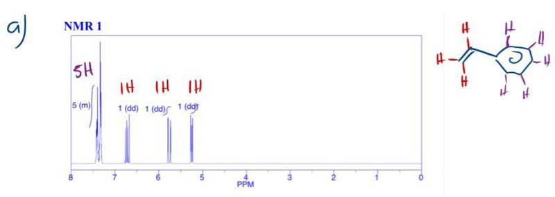 Vätekärnorna i styren är som oggih antyder inte ekvivalenta, därav de tre distinkta topparna från de tre eten-vätena. Dessa vätekäror känner också av varandra därav splittningen, även om den är väldigt begränsad.