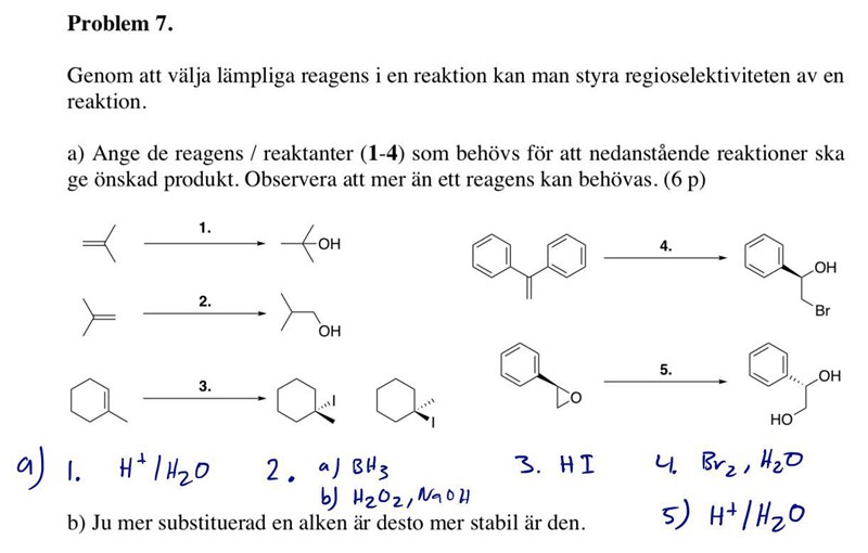 - 5. Hydrolysen av oxiran-enheten behöver inga ytterligare protoner, men de kan stabilisera ev. karbokatjon under SN-reaktionen. Oxiranetern har så pass hög strain (glömt vad det kallad på kemisvenska) att den kan klyvas utan halogensyror och dylika mer potenta föreningar.