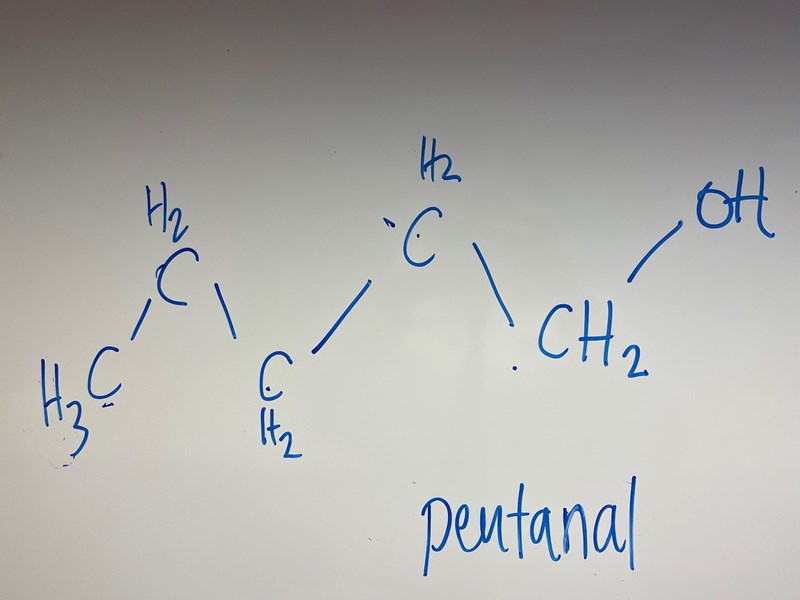 I fotot står det pentanal (aldehyden). Men i bilden är formeln för pentanol ritat, två olika saker.