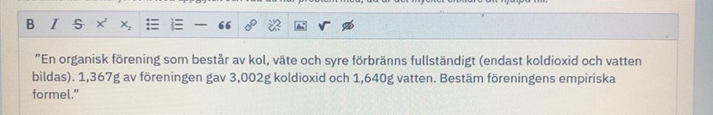 solskenet skrev:Hur många mol koldioxid bildades, när 1,367g av föreningen förbrändes?