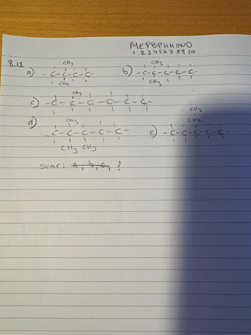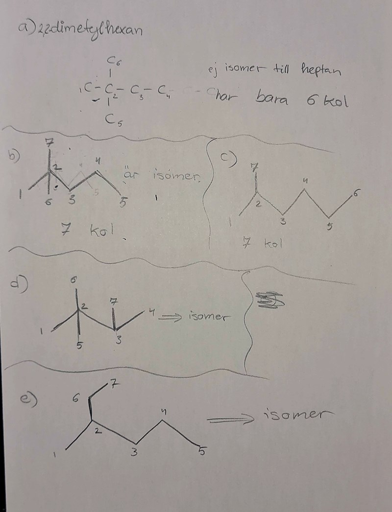 Det är bara a) som har 6 stycken kol. Alla andra molekyler har 7 st kol, och eftersom det är enkla alkaner kan du vara säker på att det det är samma antal väten.