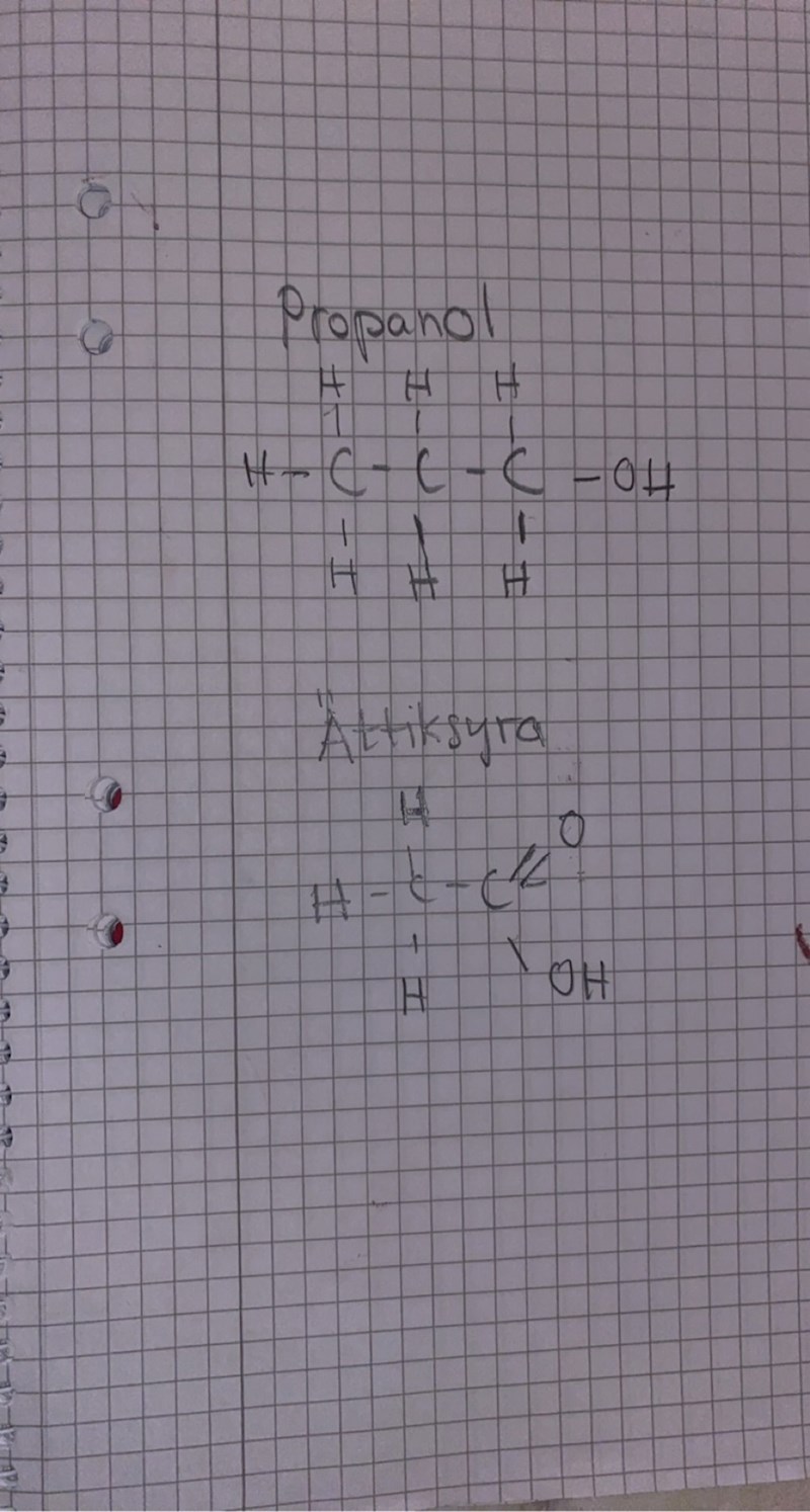 detta är det jag kommit fram till på strukturformeln för propanol och ättiksyran däremot är problemet att få fram esterns strukturformeln av denna
