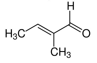 Det har en aldehyd grupp, och är en butan med dubbelbindning så det blir buten. Metyl och  dubbel bindningen är på samma kol i den här uppgift så svaren blir 2-metyl-2-butanal.